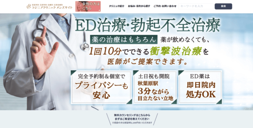 秋葉原駅から徒歩1分に位置するラジニアクリニックは、ED治療・包茎治療に対応した完全予約制のクリニックです。